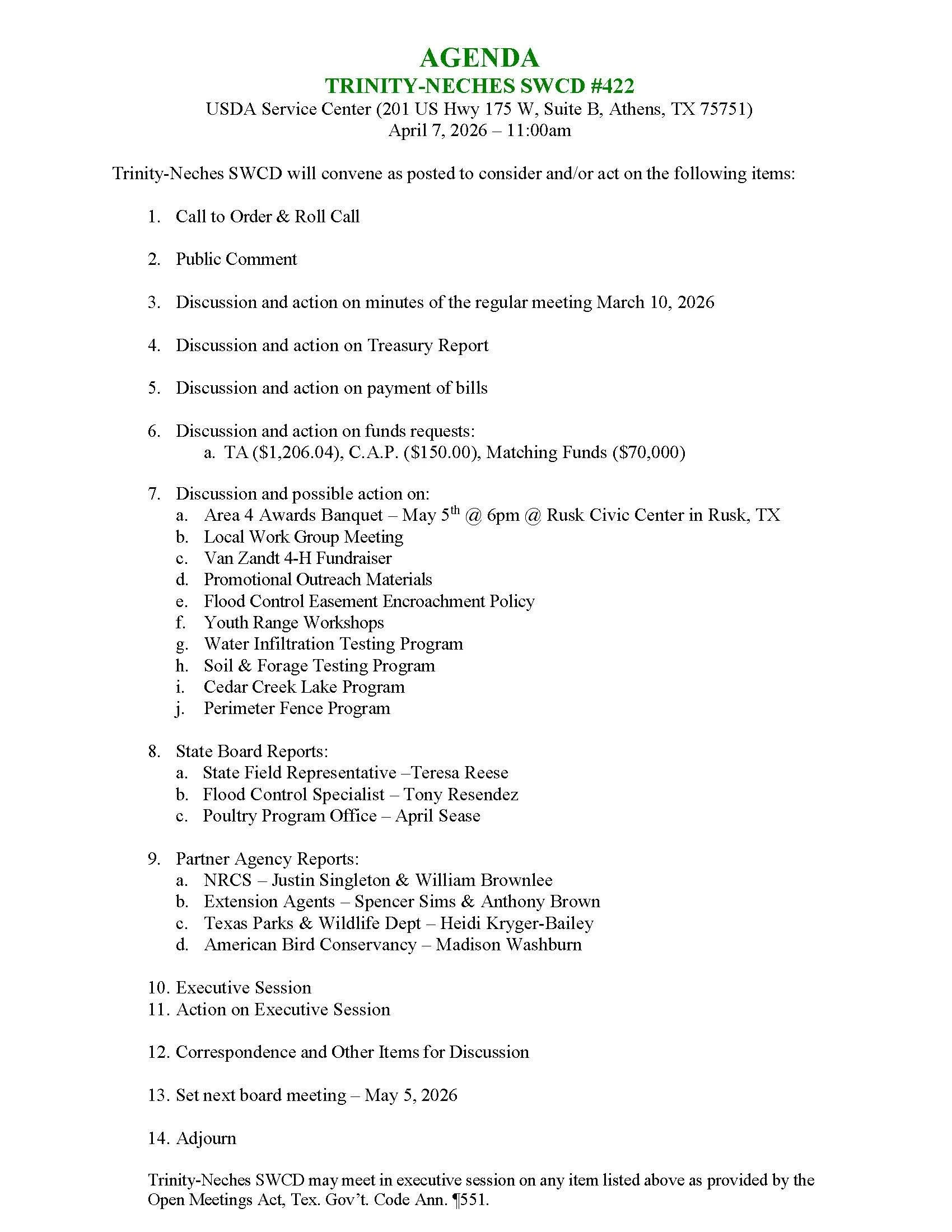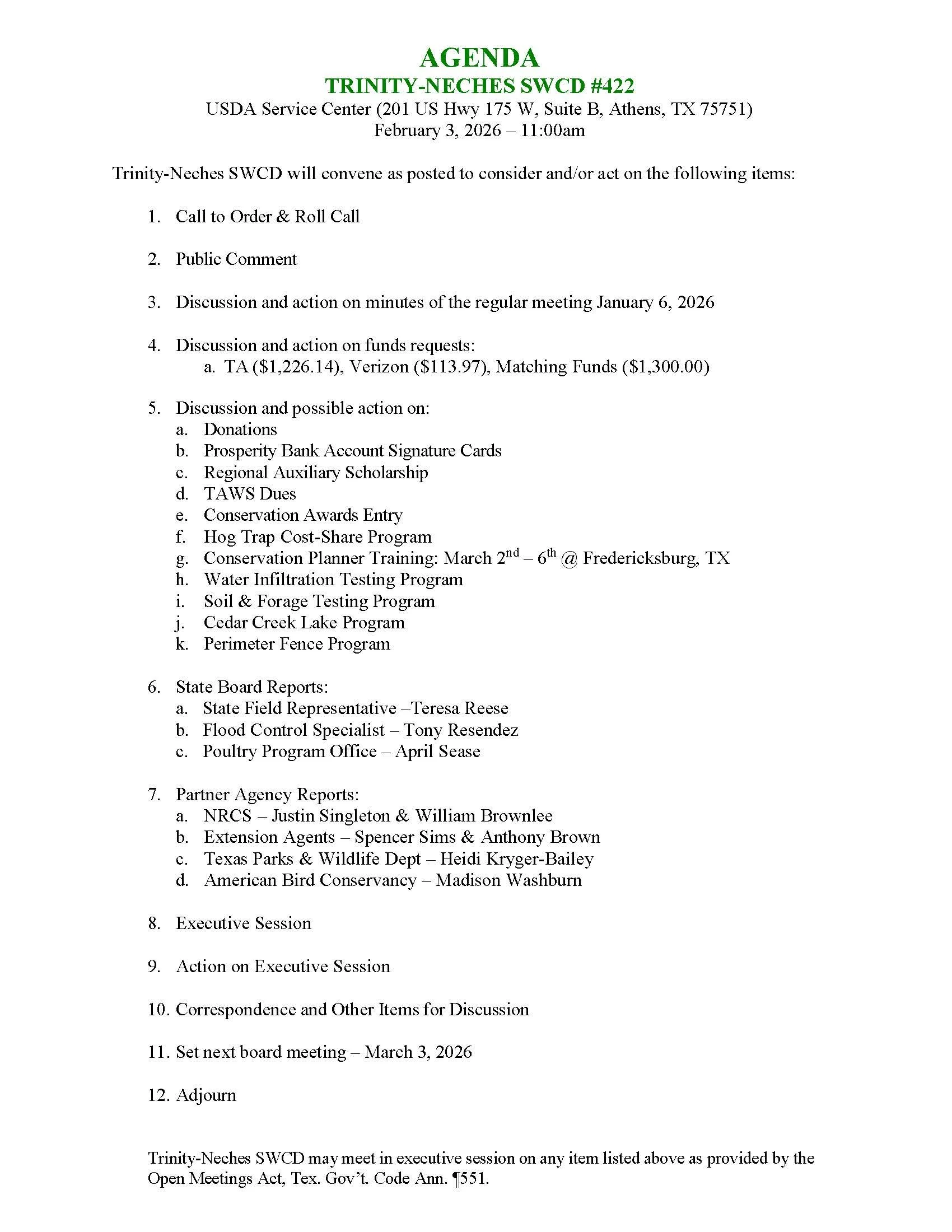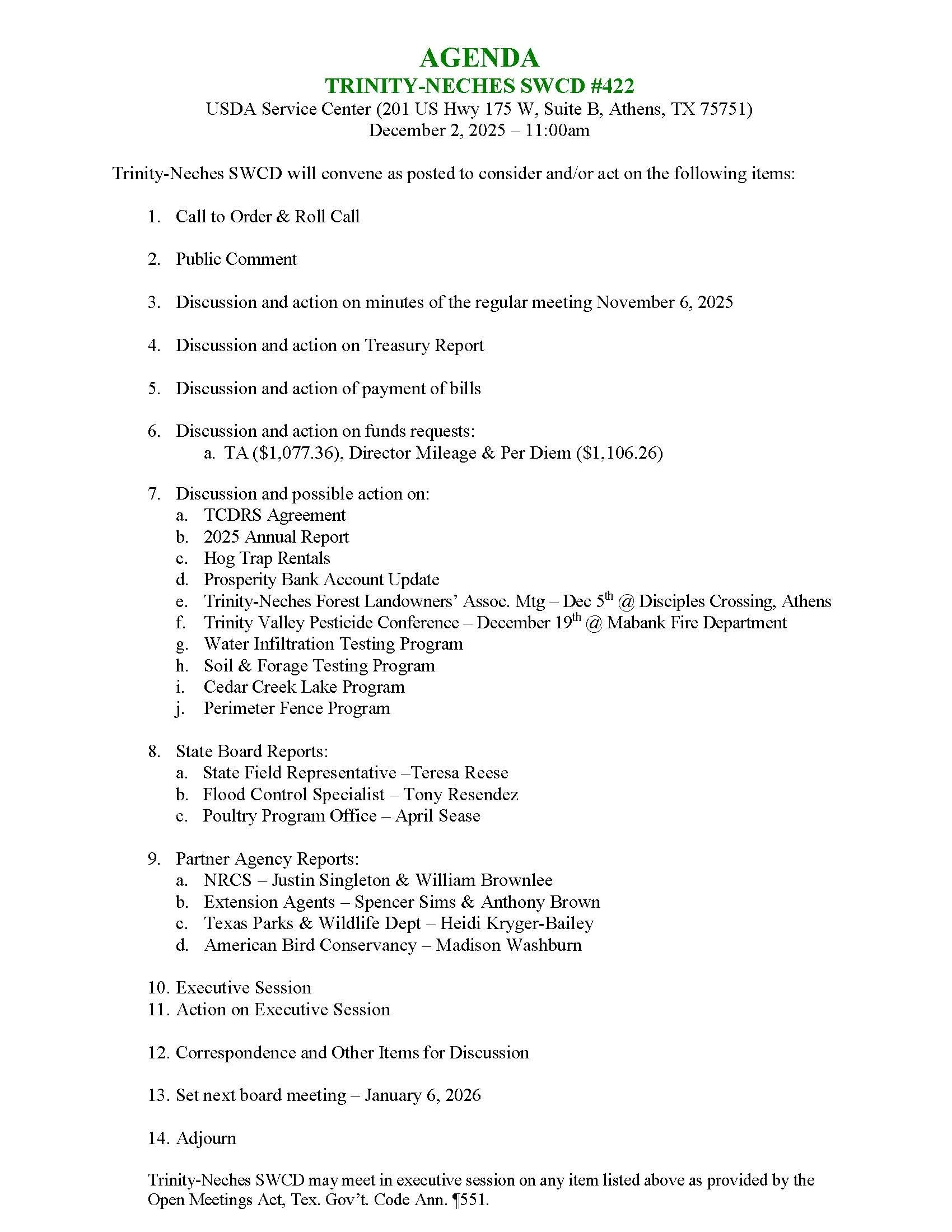 Unless otherwise stated on the agenda, our Board of Directors meets the first Tuesday of each month at 11:00 a.m. in the Conference Room of the USDA Service Center (201 US Highway 175 West, Suite B, Athens, TX 75751). These meetings are open to the public.